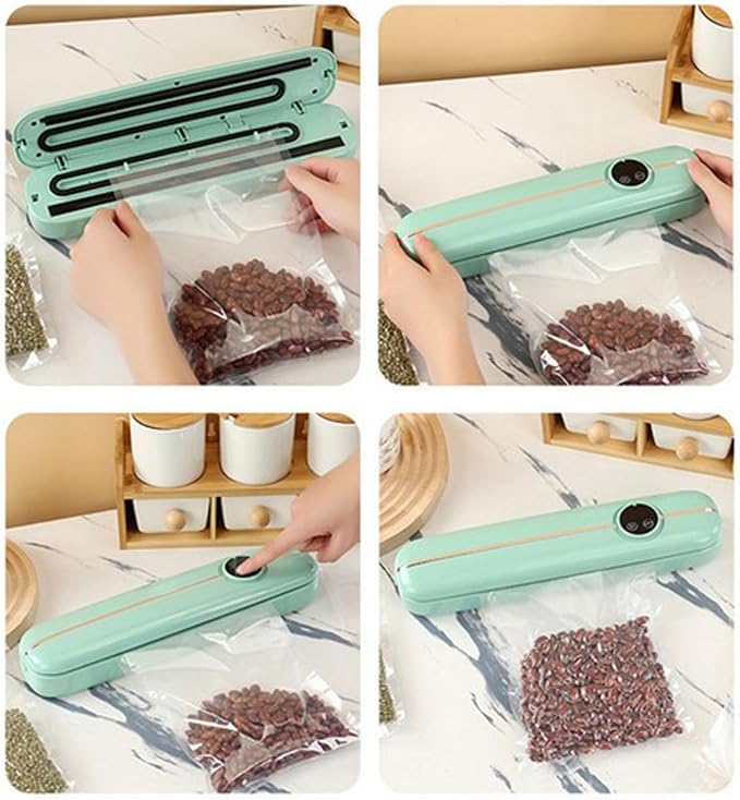 Su diseño intuitivo y compacto te permite sellar fácilmente carnes, frutas, verduras, alimentos secos y húmedos, evitando el desperdicio y conservando el sabor original.